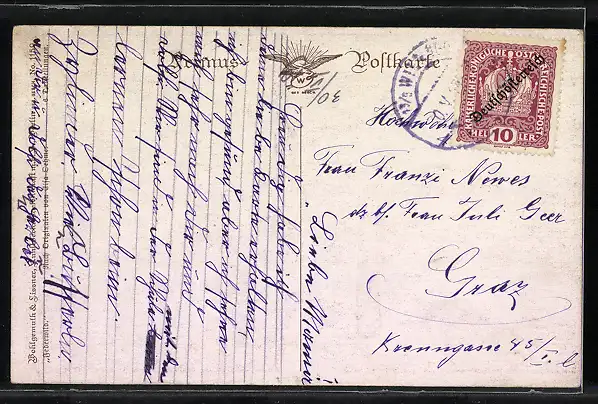 Personenbezogene Daten auf der Rückseite der Karte wurden durch blauen Textmarker unkenntlich gemacht. Die blauen Stellen sind auf die Vorderseite durchgeweicht und wirken sich negativ auf das Postkartenfoto aus