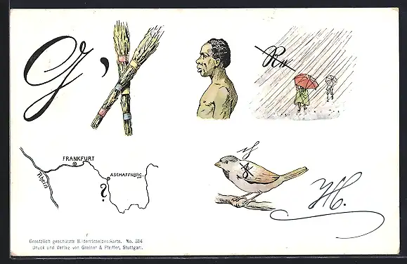 Personenbezogene Daten auf der Rückseite der Karte wurden durch blauen Textmarker unkenntlich gemacht. Die blauen Stellen sind auf die Vorderseite durchgeweicht und wirken sich negativ auf das Postkartenfoto aus