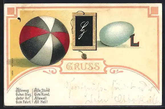 AK Rebus mit Ball, Tafel und Ei