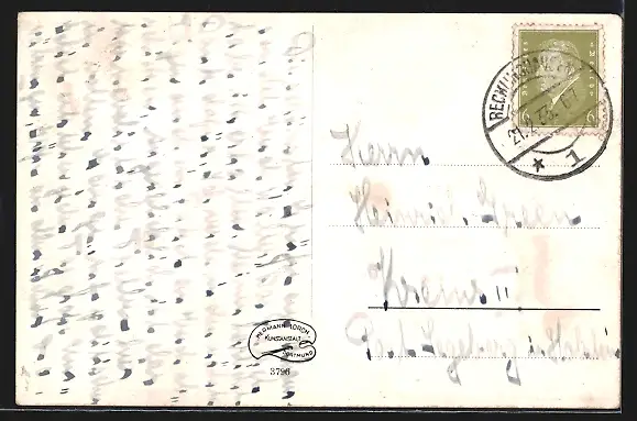 Personenbezogene Daten auf der Rückseite der Karte wurden durch blauen Textmarker unkenntlich gemacht. Die blauen Stellen sind auf die Vorderseite durchgeweicht und wirken sich negativ auf das Postkartenfoto aus