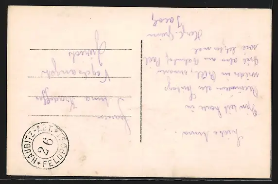 Personenbezogene Daten auf der Rückseite der Karte wurden durch blauen Textmarker unkenntlich gemacht. Die blauen Stellen sind auf die Vorderseite durchgeweicht und wirken sich negativ auf das Postkartenfoto aus