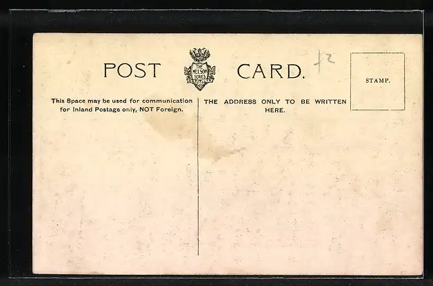 Personenbezogene Daten auf der Rückseite der Karte wurden durch blauen Textmarker unkenntlich gemacht. Die blauen Stellen sind auf die Vorderseite durchgeweicht und wirken sich negativ auf das Postkartenfoto aus
