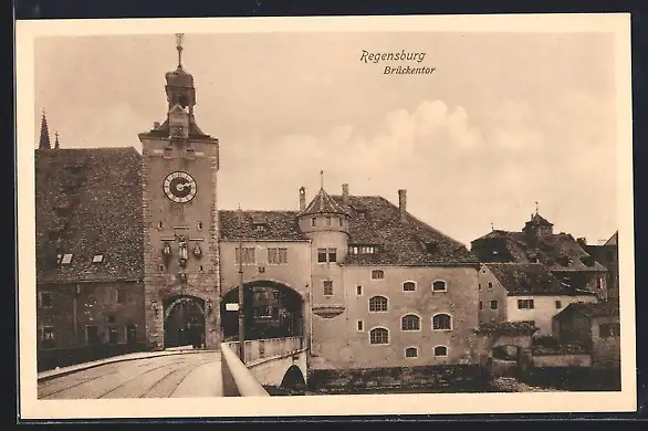 AK Regensburg, Partie am Brückentor mit Uhrenturm