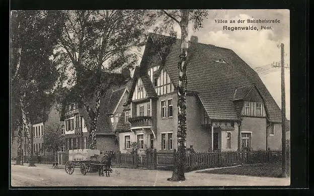 AK Regenwalde, Villen an der Bahnhofstrasse, Fuhrwerk