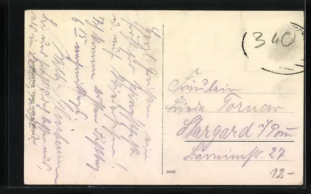 Personenbezogene Daten auf der Rückseite der Karte wurden durch blauen Textmarker unkenntlich gemacht. Die blauen Stellen sind auf die Vorderseite durchgeweicht und wirken sich negativ auf das Postkartenfoto aus