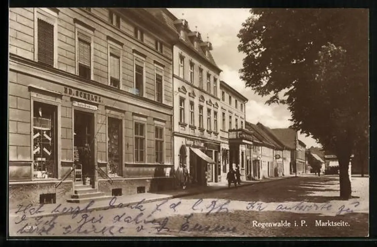 AK Regenwalde i. P., Geschäft v. Ed. Schultz, Marktseite
