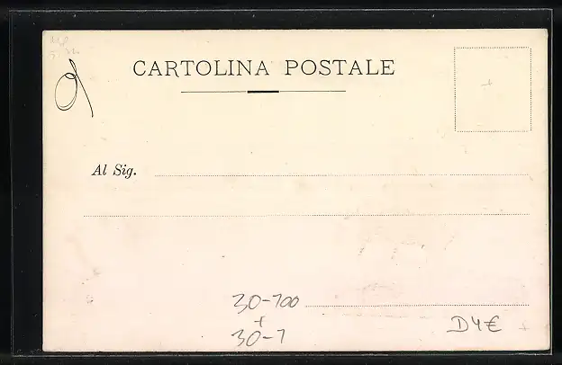 Personenbezogene Daten auf der Rückseite der Karte wurden durch blauen Textmarker unkenntlich gemacht. Die blauen Stellen sind auf die Vorderseite durchgeweicht und wirken sich negativ auf das Postkartenfoto aus