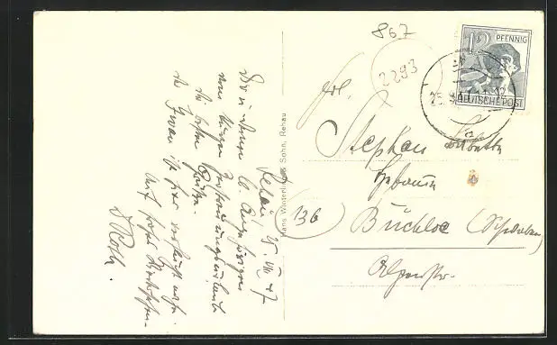 Personenbezogene Daten auf der Rückseite der Karte wurden durch blauen Textmarker unkenntlich gemacht. Die blauen Stellen sind auf die Vorderseite durchgeweicht und wirken sich negativ auf das Postkartenfoto aus
