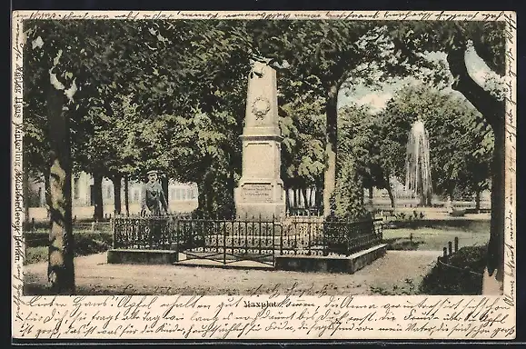 AK Rehau, Maxplatz mit Denkmal und Springbrunnen