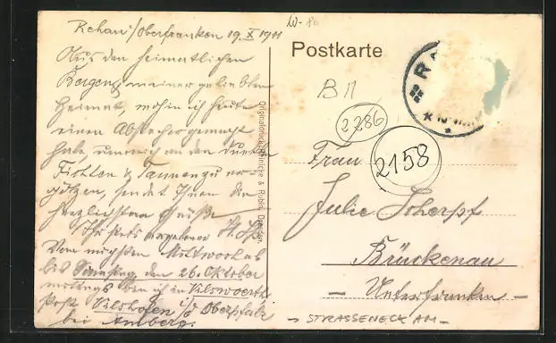 alte Ansichtskarte, gelaufen 1911, Briefmarke entfernt, rückseitig Oberflächenschaden, Eckknick re. oben, Stempelspur, guter Zustand