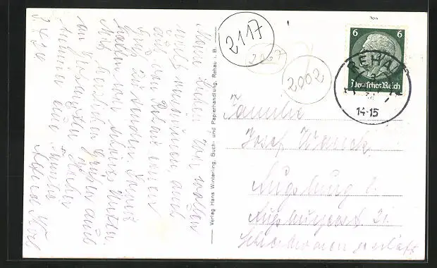 Personenbezogene Daten auf der Rückseite der Karte wurden durch blauen Textmarker unkenntlich gemacht. Die blauen Stellen sind auf die Vorderseite durchgeweicht und wirken sich negativ auf das Postkartenfoto aus