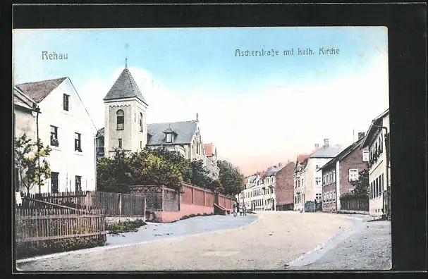 AK Rehau in Bayern, Ascherstrasse mit kath. Kirche