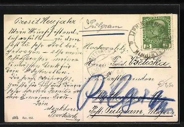 Personenbezogene Daten auf der Rückseite der Karte wurden durch blauen Textmarker unkenntlich gemacht. Die blauen Stellen sind auf die Vorderseite durchgeweicht und wirken sich negativ auf das Postkartenfoto aus