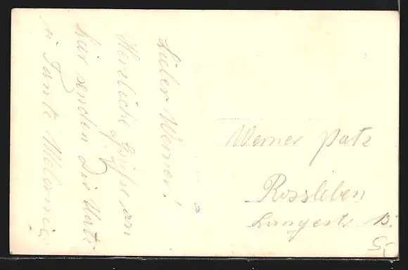 Personenbezogene Daten auf der Rückseite der Karte wurden durch blauen Textmarker unkenntlich gemacht. Die blauen Stellen sind auf die Vorderseite durchgeweicht und wirken sich negativ auf das Postkartenfoto aus