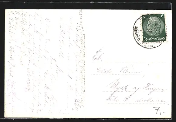 Personenbezogene Daten auf der Rückseite der Karte wurden durch blauen Textmarker unkenntlich gemacht. Die blauen Stellen sind auf die Vorderseite durchgeweicht und wirken sich negativ auf das Postkartenfoto aus