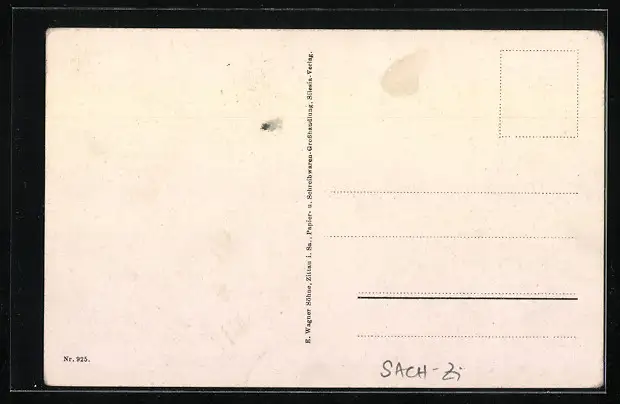 Personenbezogene Daten auf der Rückseite der Karte wurden durch blauen Textmarker unkenntlich gemacht. Die blauen Stellen sind auf die Vorderseite durchgeweicht und wirken sich negativ auf das Postkartenfoto aus