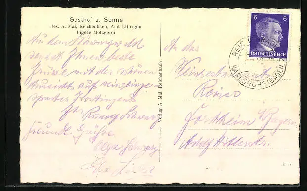 Personenbezogene Daten auf der Rückseite der Karte wurden durch blauen Textmarker unkenntlich gemacht. Die blauen Stellen sind auf die Vorderseite durchgeweicht und wirken sich negativ auf das Postkartenfoto aus