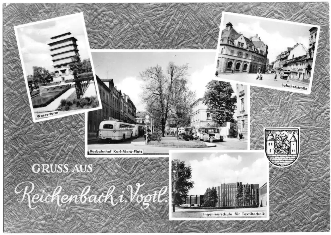 Ansichtskarte Reichenbach Vogtl. vier Abb., - Wasserturm, Busbahnhof, Bahnhofstr., Ingenieurschule Erhaltung I-II postalisch gelaufen, gestempelt: Reichenbach, 25.10.67 Druckvermerk: 1966 Herstellungsland: DDR Verlag: Bild und Heimat Reichenbach - 14/3328/2