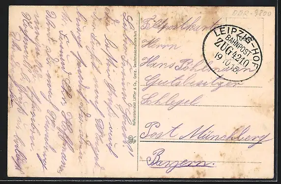 Personenbezogene Daten auf der Rückseite der Karte wurden durch blauen Textmarker unkenntlich gemacht. Die blauen Stellen sind auf die Vorderseite durchgeweicht und wirken sich negativ auf das Postkartenfoto aus