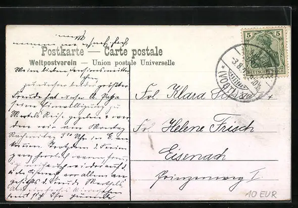 Personenbezogene Daten auf der Rückseite der Karte wurden durch blauen Textmarker unkenntlich gemacht. Die blauen Stellen sind auf die Vorderseite durchgeweicht und wirken sich negativ auf das Postkartenfoto aus