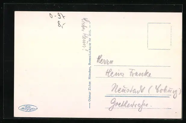 Personenbezogene Daten auf der Rückseite der Karte wurden durch blauen Textmarker unkenntlich gemacht. Die blauen Stellen sind auf die Vorderseite durchgeweicht und wirken sich negativ auf das Postkartenfoto aus