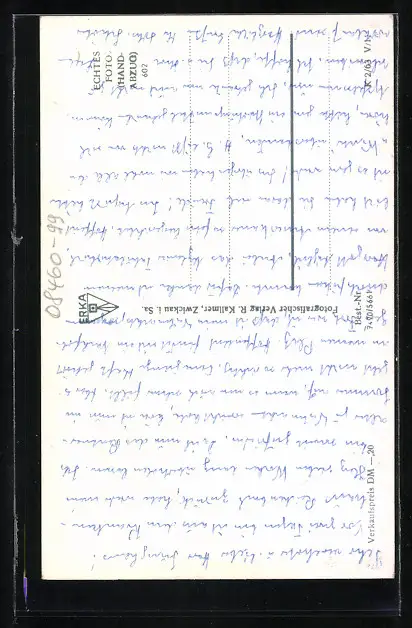 Personenbezogene Daten auf der Rückseite der Karte wurden durch blauen Textmarker unkenntlich gemacht. Die blauen Stellen sind auf die Vorderseite durchgeweicht und wirken sich negativ auf das Postkartenfoto aus