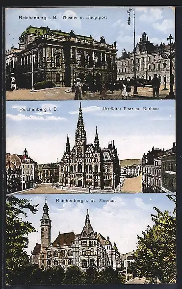 AK Reichenberg / Liberec, Theater und Hauptpost, Museum, Altstädter Platz mit Rathaus