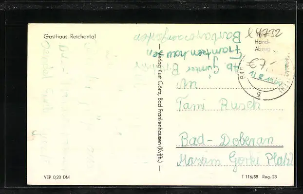 Personenbezogene Daten auf der Rückseite der Karte wurden durch blauen Textmarker unkenntlich gemacht. Die blauen Stellen sind auf die Vorderseite durchgeweicht und wirken sich negativ auf das Postkartenfoto aus