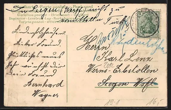Personenbezogene Daten auf der Rückseite der Karte wurden durch blauen Textmarker unkenntlich gemacht. Die blauen Stellen sind auf die Vorderseite durchgeweicht und wirken sich negativ auf das Postkartenfoto aus