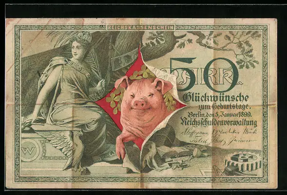 AK Reichskassenschein 50 Mark, Glücksschwein, Geld