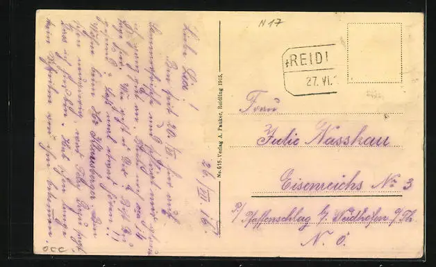 Personenbezogene Daten auf der Rückseite der Karte wurden durch blauen Textmarker unkenntlich gemacht. Die blauen Stellen sind auf die Vorderseite durchgeweicht und wirken sich negativ auf das Postkartenfoto aus