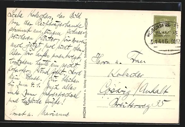Personenbezogene Daten auf der Rückseite der Karte wurden durch blauen Textmarker unkenntlich gemacht. Die blauen Stellen sind auf die Vorderseite durchgeweicht und wirken sich negativ auf das Postkartenfoto aus