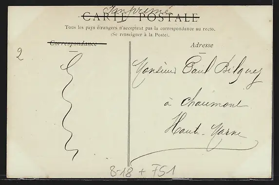 Personenbezogene Daten auf der Rückseite der Karte wurden durch blauen Textmarker unkenntlich gemacht. Die blauen Stellen sind auf die Vorderseite durchgeweicht und wirken sich negativ auf das Postkartenfoto aus