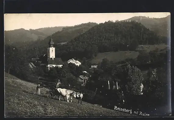 AK Reinsberg, Rindergespann vor der Kirche, Ruine im Hintergrund