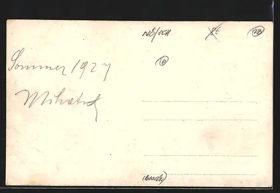 Personenbezogene Daten auf der Rückseite der Karte wurden durch blauen Textmarker unkenntlich gemacht. Die blauen Stellen sind auf die Vorderseite durchgeweicht und wirken sich negativ auf das Postkartenfoto aus