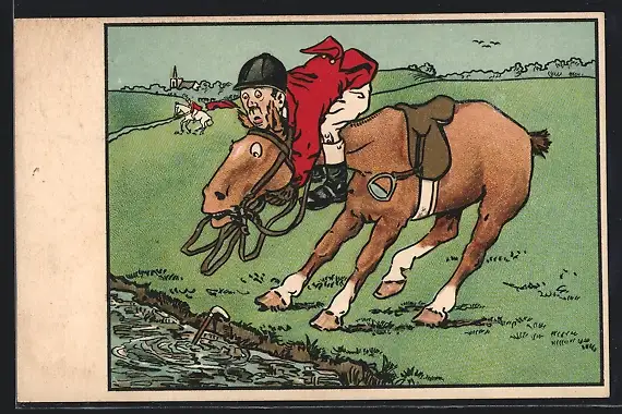 AK Reiter auf scheuendem Pferd vor einem Wassergraben