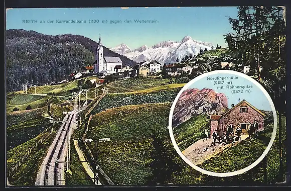 AK Reith, Ortsansicht gegen Wetterstein, Karwendelbahn, Nördlingerhütte mit Reitherspitze