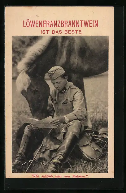 AK Reklame Löwenfranzbranntwein, Frontsoldat mit Brief und Pferd