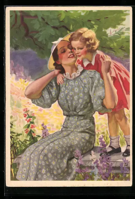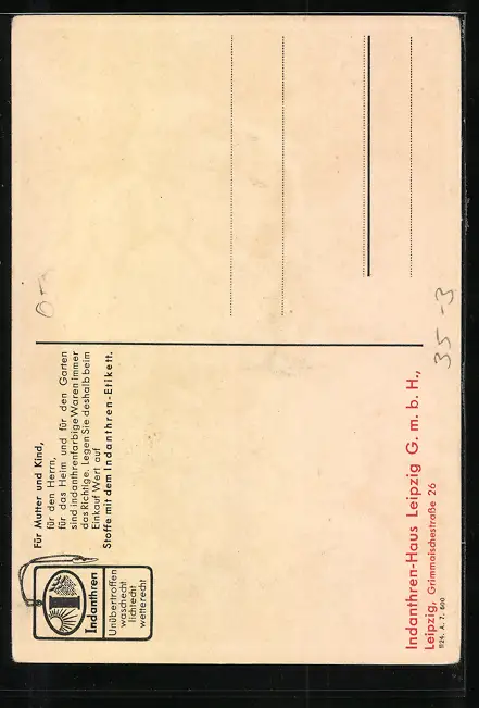 AK Reklame für Indanthren-Stoffe, Mutter in blauem Kleid umarmt ihr Töchterchen in rotem Hängerchen