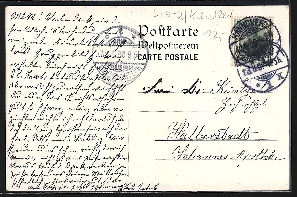 Personenbezogene Daten auf der Rückseite der Karte wurden durch blauen Textmarker unkenntlich gemacht. Die blauen Stellen sind auf die Vorderseite durchgeweicht und wirken sich negativ auf das Postkartenfoto aus