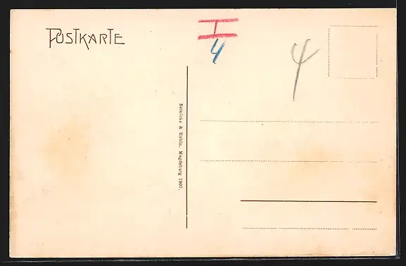 Personenbezogene Daten auf der Rückseite der Karte wurden durch blauen Textmarker unkenntlich gemacht. Die blauen Stellen sind auf die Vorderseite durchgeweicht und wirken sich negativ auf das Postkartenfoto aus