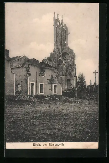 AK Rémonoville, Blick auf die zerstörte Kirche