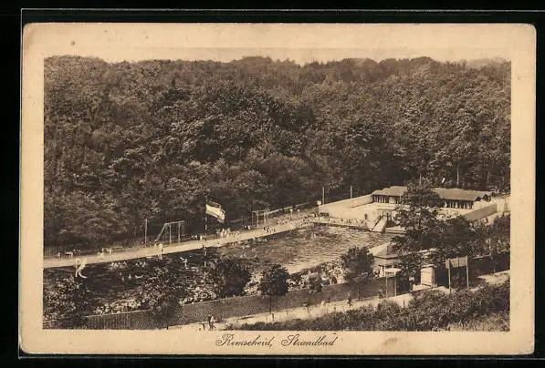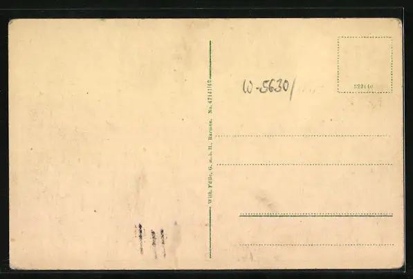Personenbezogene Daten auf der Rückseite der Karte wurden durch blauen Textmarker unkenntlich gemacht. Die blauen Stellen sind auf die Vorderseite durchgeweicht und wirken sich negativ auf das Postkartenfoto aus