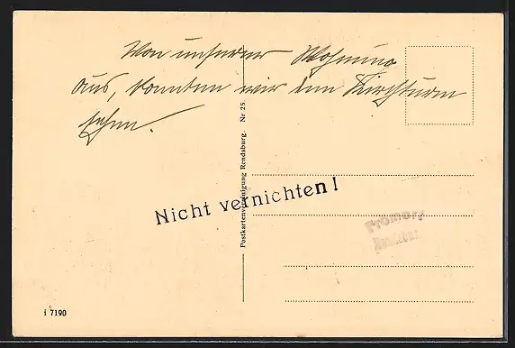 Personenbezogene Daten auf der Rückseite der Karte wurden durch blauen Textmarker unkenntlich gemacht. Die blauen Stellen sind auf die Vorderseite durchgeweicht und wirken sich negativ auf das Postkartenfoto aus