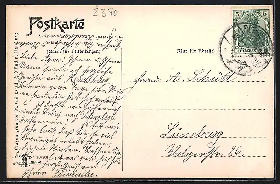 Personenbezogene Daten auf der Rückseite der Karte wurden durch blauen Textmarker unkenntlich gemacht. Die blauen Stellen sind auf die Vorderseite durchgeweicht und wirken sich negativ auf das Postkartenfoto aus