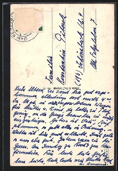 alte Ansichtskarte, gelaufen, Briefmarke entfernt, rückseitig Oberflächenschaden, Eckknicke li. unten u. re. oben, Stempelspur, guter Zustand
