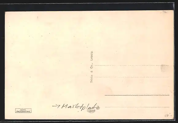 Personenbezogene Daten auf der Rückseite der Karte wurden durch blauen Textmarker unkenntlich gemacht. Die blauen Stellen sind auf die Vorderseite durchgeweicht und wirken sich negativ auf das Postkartenfoto aus