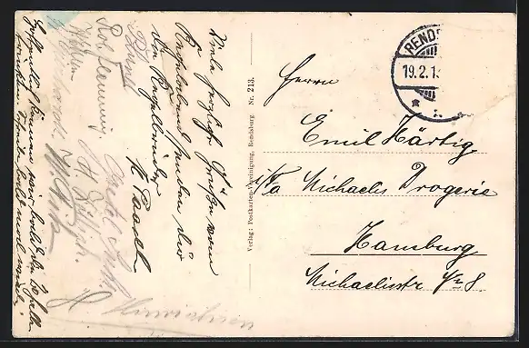 Personenbezogene Daten auf der Rückseite der Karte wurden durch blauen Textmarker unkenntlich gemacht. Die blauen Stellen sind auf die Vorderseite durchgeweicht und wirken sich negativ auf das Postkartenfoto aus