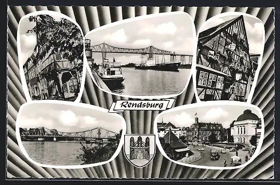 AK Rendsburg, Schiffe an der Brücke, Strassenpartie, Fachwerkhäuser