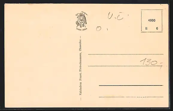 Personenbezogene Daten auf der Rückseite der Karte wurden durch blauen Textmarker unkenntlich gemacht. Die blauen Stellen sind auf die Vorderseite durchgeweicht und wirken sich negativ auf das Postkartenfoto aus